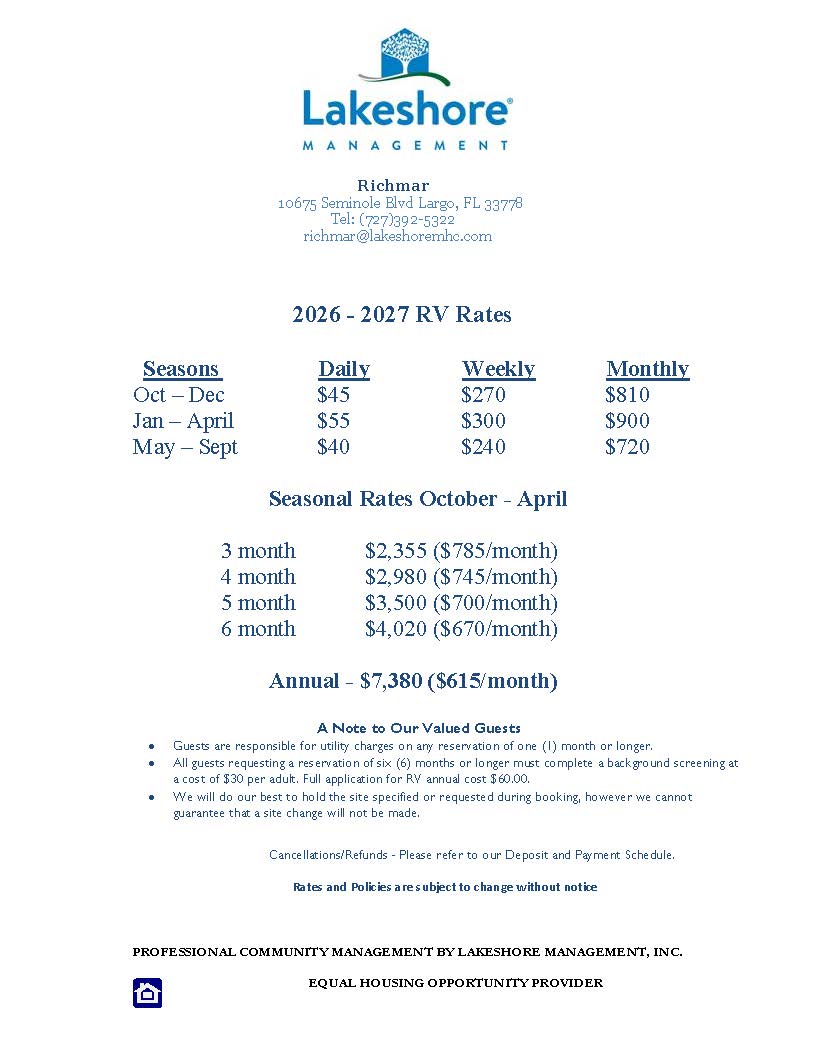 All RV’s must have self-contained sanitary facilities. We are committed to maintaining a clean and healthy environment for our residents and we request that our tenants, homeowners and visitors assist in keeping this commitment.
